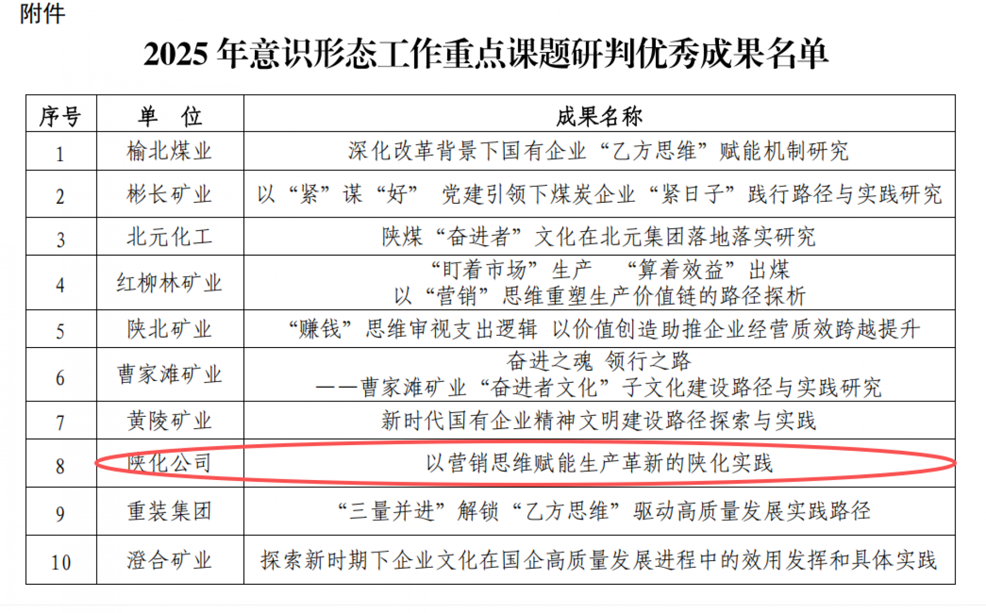 陜化公司意識(shí)形態(tài)課題獲評(píng)陜煤集團(tuán)2025年優(yōu)秀成果